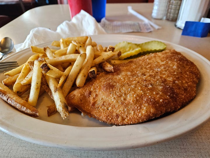 Rocketing down I-94 was far less electrically-sparse than North Dakota State Road 22 - the trip was uneventful, more than anything else. I can't imagine having done a trip like this before Google Maps, though. And being able to, as I pull into a new town, ask an LLM about how to avoid putting my foot in my mouth by speaking ill of the wrong local industry, or how to pronounce the local specialty food (flesh-KEEK-luh), goes a long way towards curbing social anxiety. The food itself reminded me of the pielmeni we'd cook and eat back in high school Russian class - a similar dill-and-sour-cream flavor to breaded meat substance.