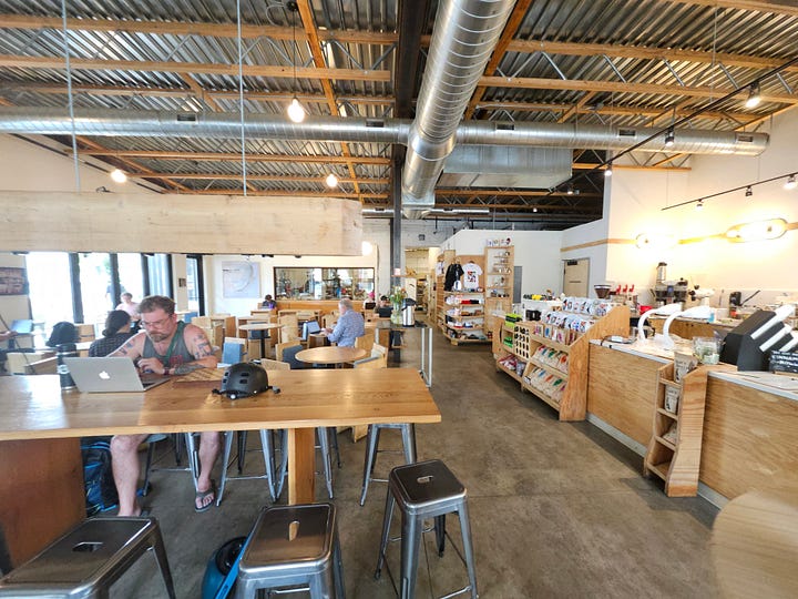 That coffee shop captures the modern nomadic workspace aesthetic - exposed ductwork, industrial stools, everyone on laptops pretending they're not eavesdropping on each other's lives. The kind of place where you can write about parasocial relationships while surrounded by actual humans you'll never speak to.