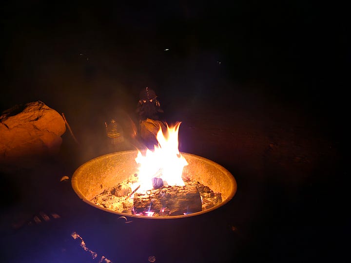 The park was beautiful, but the campsite was... too well lit and too crowded, for my taste. I built a fire in the communal fire pit on the opposite side of the lit area once the sun set - collected fallen tinder, a bit of proper firewood, some dryer lint kindling, and my trusty flint and steel, but despite the wandering of those with dogs, nobody cared to join me and chat. The nearby laundry building (!) ended up more crowded than my space under the stars - looking in the window, I could see a couple of people silently flicking screen. There's a quiet kind of despair to that, and it unsettled me.