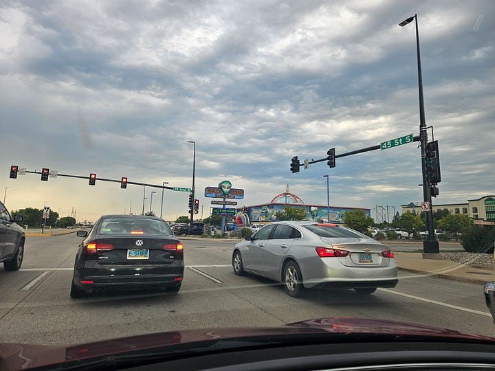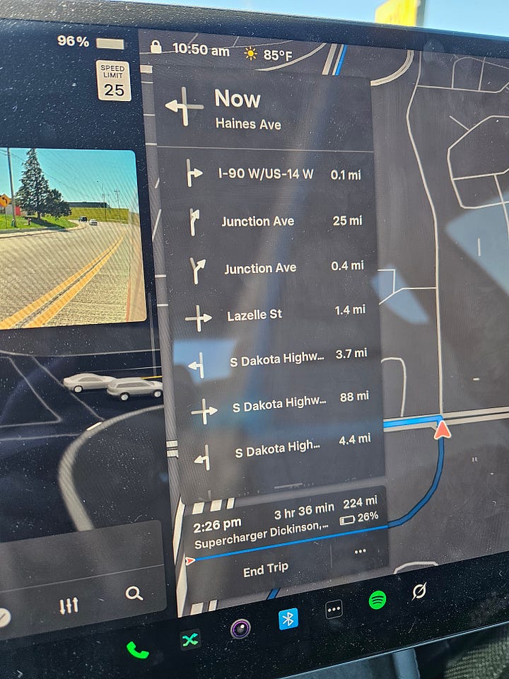 When I left Rapid City, my car said I was expected to arrive in Dickenson (the next charger, about 230 miles north) with a 27% charge. About 30 miles later, it was saying I'd arrive at 20%, and my weather app was claiming 95+ degrees outside, and I started to get really nervous. I spent maybe 20 minutes talking to Grok (onboard, now), about the relative drain from things like A/C, music, internal lighting, and the actual forward momentum of the vehicle at different speeds. I ended up running the A/C only at 85 degrees and putting cruise control on at 65, and I made it to the next charger at about 12% remaining. I think that's the worst single stretch for my entire trip - not a lot of need for infrastructure between North and South Dakota on the west side.