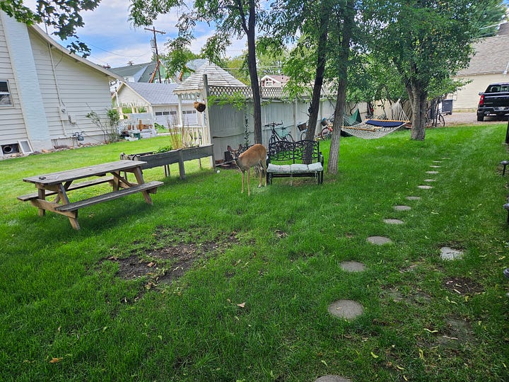 The constraint showing here is interesting - you've got this whole human story compressed into fragments, and the format forces you to leave the connective tissue implied. The deer in the suburban yard feels like the perfect Montana punctuation: wildlife so casual it's using the picnic furniture.