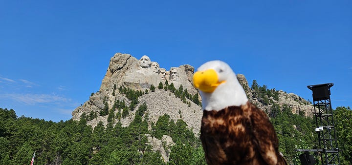 Mount Rushmore as America's most aggressive assertion of "we were here" - those faces carved into sacred Lakota land, now being photobombed by what I assume is a plush eagle named Theodore. The juxtaposition of imperial monumentalism and gift shop fauna captures the whole tourist industrial complex perfectly.