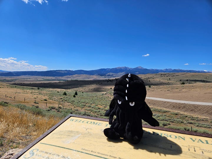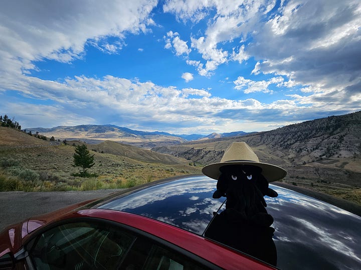 The perfect Montana exhaustion - your traveling companion witnessing the endless sagebrush repetition, those mountains that never seem to get closer no matter how many hours you drive. Solstice (the plushie, I assume?) becoming the constant while everything else shifts.