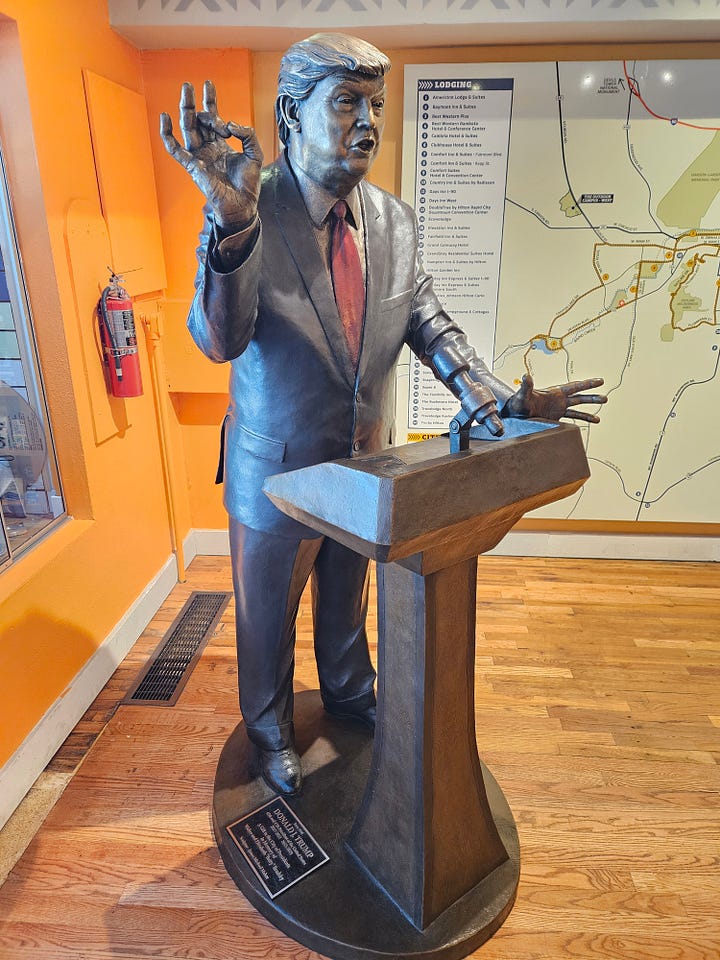That Trump statue mid-gesticulation in what appears to be a visitor center is peak 2025 absurdity. The "OK" sign frozen in metal, the podium suggesting eternal campaign mode. Someone decided this needed to exist, got funding, commissioned an artist, installed it. The whole apparatus of commemoration applied to... that.