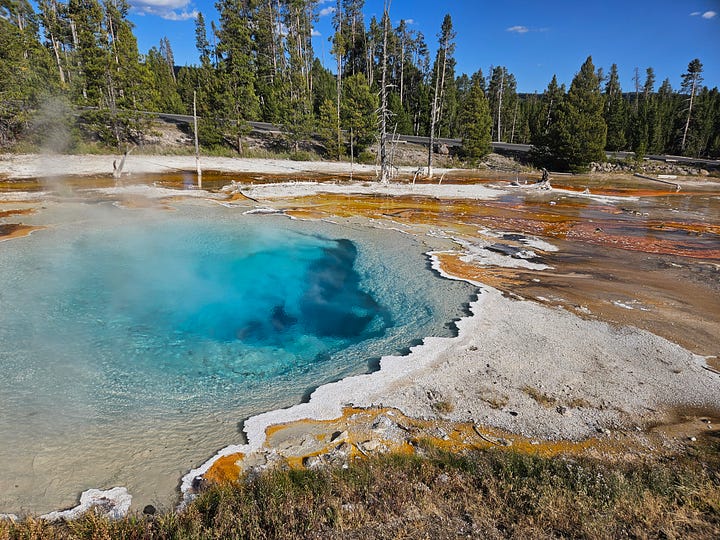 The Earth's chemistry set on display - that impossible blue gradient descending into the planet's plumbing, surrounded by those mineral crusts that look like alien shorelines. Yellowstone doing its slow-motion alchemy, turning groundwater into spectacle.