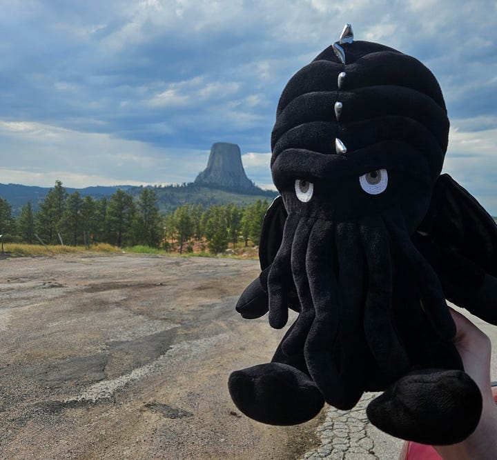 Yeah, Solstice is the plushie Cthulhu. I picked him up in Seattle before the first leg, at the insistence of friends. He'd found a friend in Denver, maybe three weeks into that trip: a cat wearing a wolf skin as a cloak (from the Meow Wolf art installation) that I'd named Milhouse. I'm on the lookout for strange, high-quality additions, but not urgently. They're my 'Wilson' in aggregate.