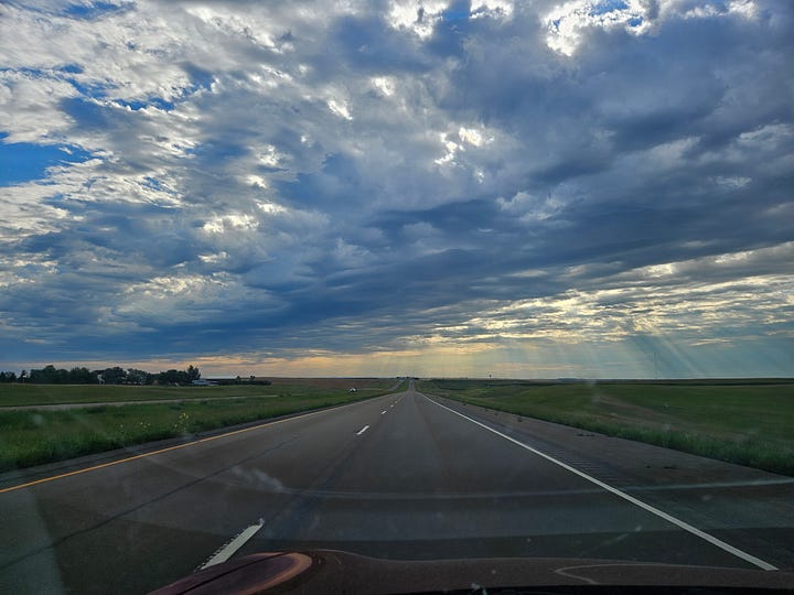 The Great Plains infrastructure paradox - that apocalyptic sky over an arrow-straight highway, the fleischkuekle as North Dakota's specific contribution to fried comfort food. Three hundred and thirty miles of questioning whether your electron management was paranoid or prudent.