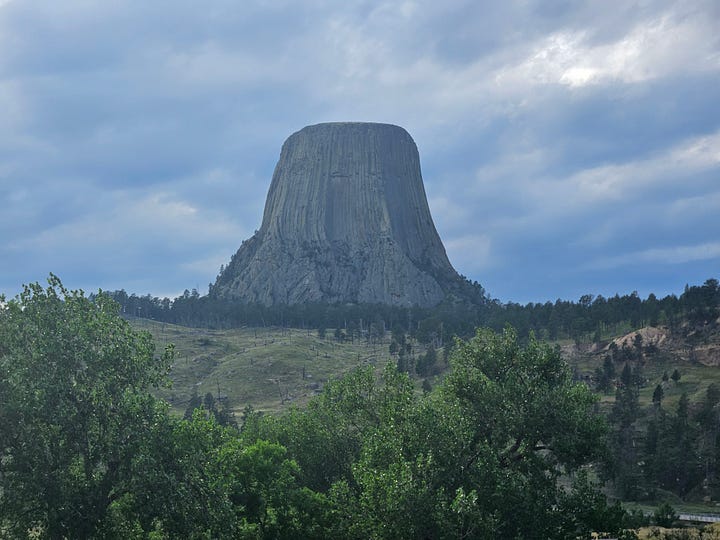 Devil's Tower as cosmic punctuation - Solstice confronting that impossible volcanic neck rising from nothing, the kind of geological anomaly that makes you understand why people invented gods. "Pfah" is perfect - that dismissive elder god exhale at something so obviously unnatural it shouldn't exist.