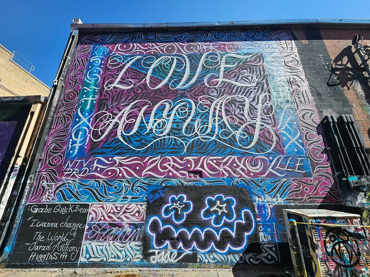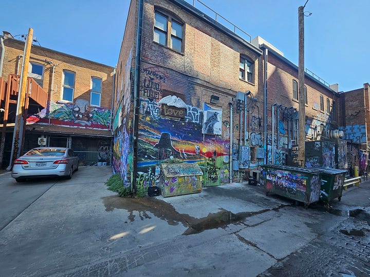 The art alley as Rapid City's id revealed - that layers-upon-layers graffiti wall telling a completely different story than the presidential bronze and manicured gardens. "LOVE ALWAYS" in ornate script while Devil's Tower lurks in the background mural, the whole thing tagged and counter-tagged into beautiful chaos.