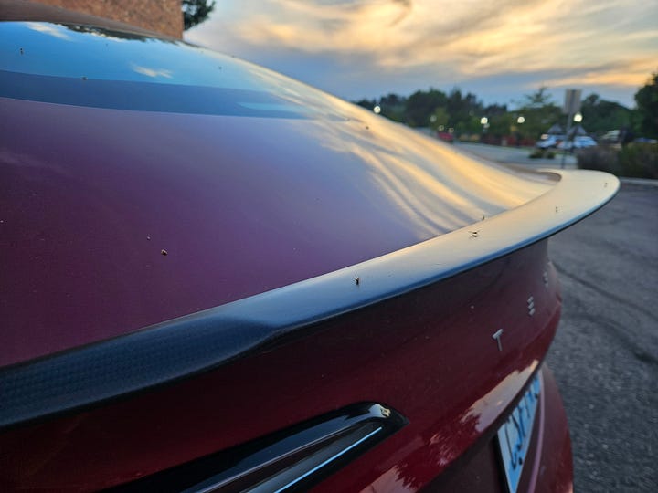 That Tesla spoiler collecting bug casualties like a trophy board - the price of crossing that much prairie at highway speeds. Each splatter a tiny testament to the miles covered, the ecosystems traversed.