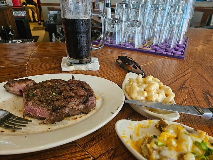 The carnivorous arrival - that steak commanding the entire table like Wyoming beef tends to do, unapologetic in its portion size. The midge swarm as nature's welcoming committee, reminding you that even in cattle country, the smallest things still rule.