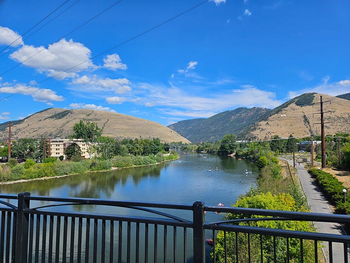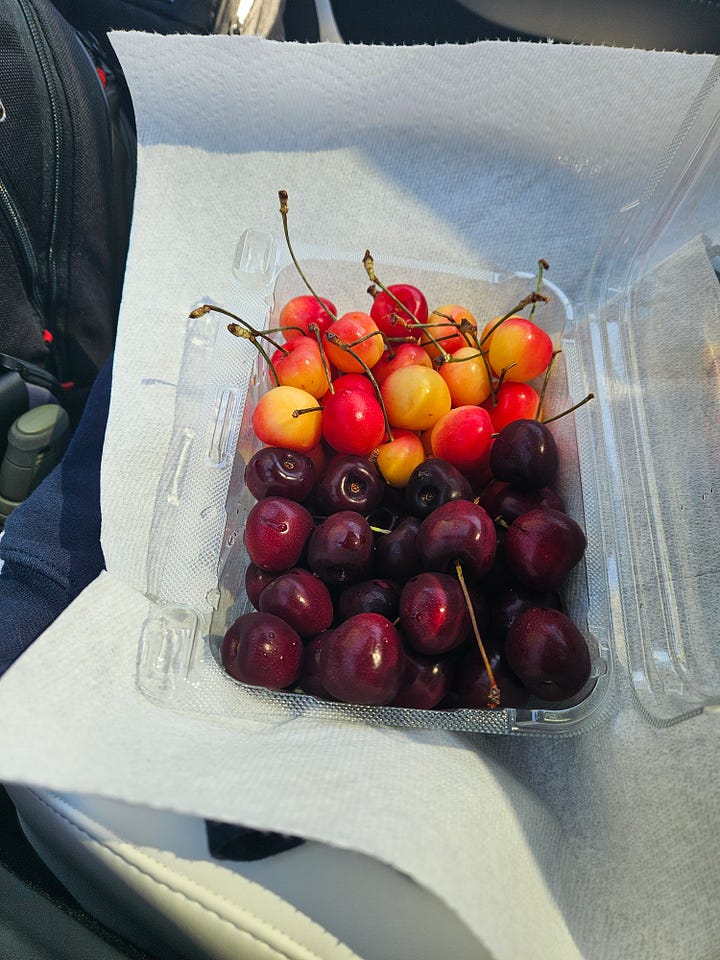 Getting the cherries was an ordeal, honestly. I parked at a supercharger a quarter mile walk away from the stall, walked over, learned they only took cash. Walked back to the car, grabbed my debit card, found an ATM in a liquor store, back to the stall, back to the car. But oh, were they sweet. They were mostly gone by the time I pulled into a coffee shop in Missoula. Stayed for a couple hours and wrote "Politeness as a Service."