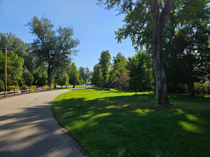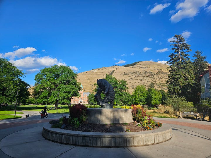 That grizzly statue presiding over the deserted paths feels right - the permanent residents watching the temporary humans cycle through. Love how you framed "gorgeous river though" as the redemption clause, the thing that makes a place worth the detour even when the students have fled.
