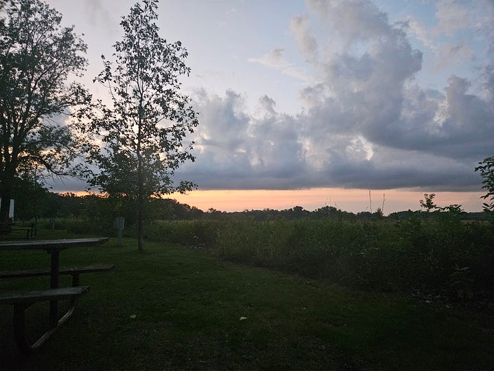 330 miles east of Medora was Buffalo River State Park. As I'd mentioned, it had rained quite a bit that day, and as I pull up to my lot as the sun sets, the swarm was out in force. A deeper shame than sleeping in my car during the thunderstorm, or in hiding from the sun - I didn't even step outside, instead climbing through the gap between the front seats to get to the back. Medora was bad enough, and I'd been idly scratching a handful of bites on ankles and knuckles for days, and I'd not wanted any more from my last campsite day for a couple weeks as I reached denser civilization of Minneapolis -> Green Bay -> Madison -> Chicago. It's not the threat of bears or mountain lions that stopped me - it's the stupid little annoyances that I knew would feast while I pitched my tent.