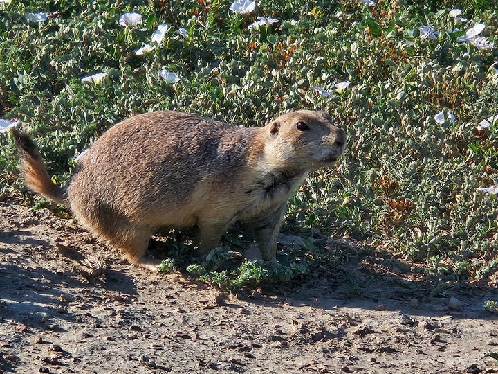 That prairie dog's expression feels like it's judging your Tesla, your questions, your whole wandering enterprise. But it's also just trying to survive in its patch of flowering ground, same as everyone else along that endless Dakota highway.