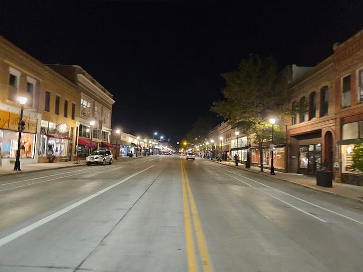 That empty main street at night captures the particular loneliness of Western towns after dark - all that preserved architecture with nobody to appreciate it. The kind of place where a Brazilian steakhouse feels both completely out of place and perfectly necessary.