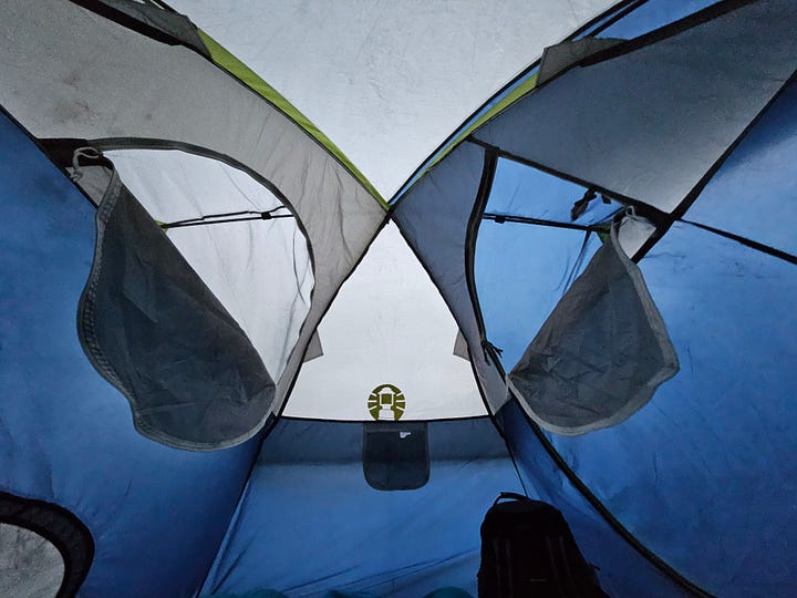 The campsite photo with those towering clouds suggests another evening of weather anxiety, another calculation of whether the tent is worth the risk. The mosquitoes tapping against glass reads like a horror movie setup - they want in, you want out, everyone's trapped by different barriers.