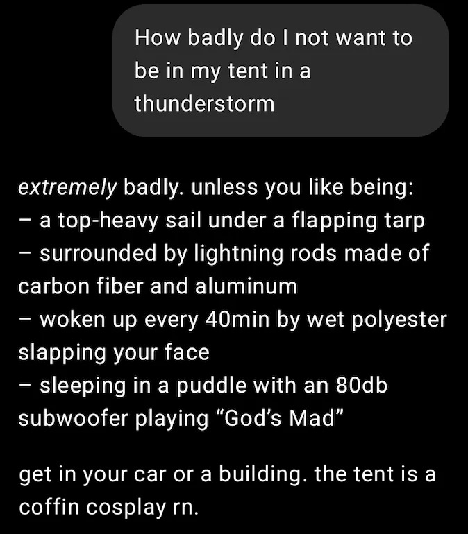 The inevitable Tesla-as-tent moment - that ChatGPT exchange perfectly capturing the gulf between theoretical camping and actual prairie thunderstorms. "Coffin cosplay" is brutally accurate for what a tent becomes when the sky opens up.