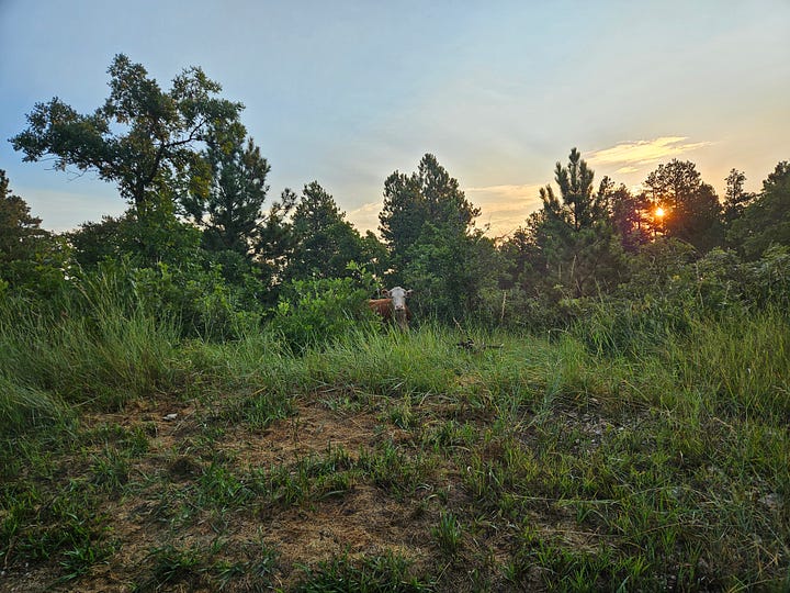 That sunset cow witnessing another day's end in South Dakota - the actual residents going about their business while tourists stream past toward the stone presidents. Theodore getting his obligatory photo op at the monument that's somehow both exactly what you expect and still absurd when you finally see it in person.