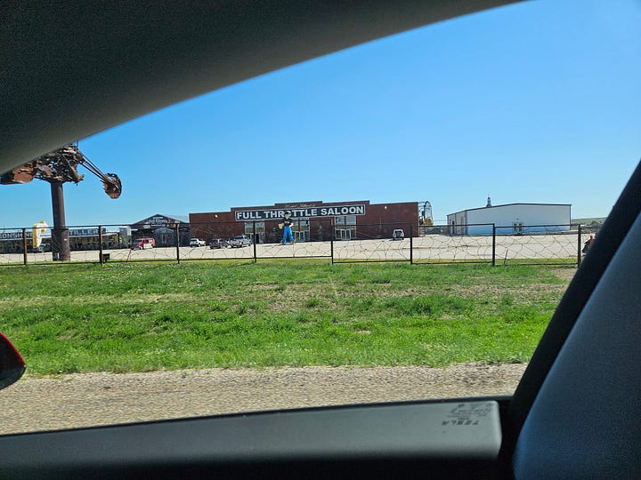 The Full Throttle Saloon as prairie punctuation - that perfect American absurdity of a destination bar in the middle of nowhere, metal sculpture reaching toward nothing. The 224 miles to Dickinson representing real range anxiety territory for a Tesla in 85-degree heat with the A/C running.